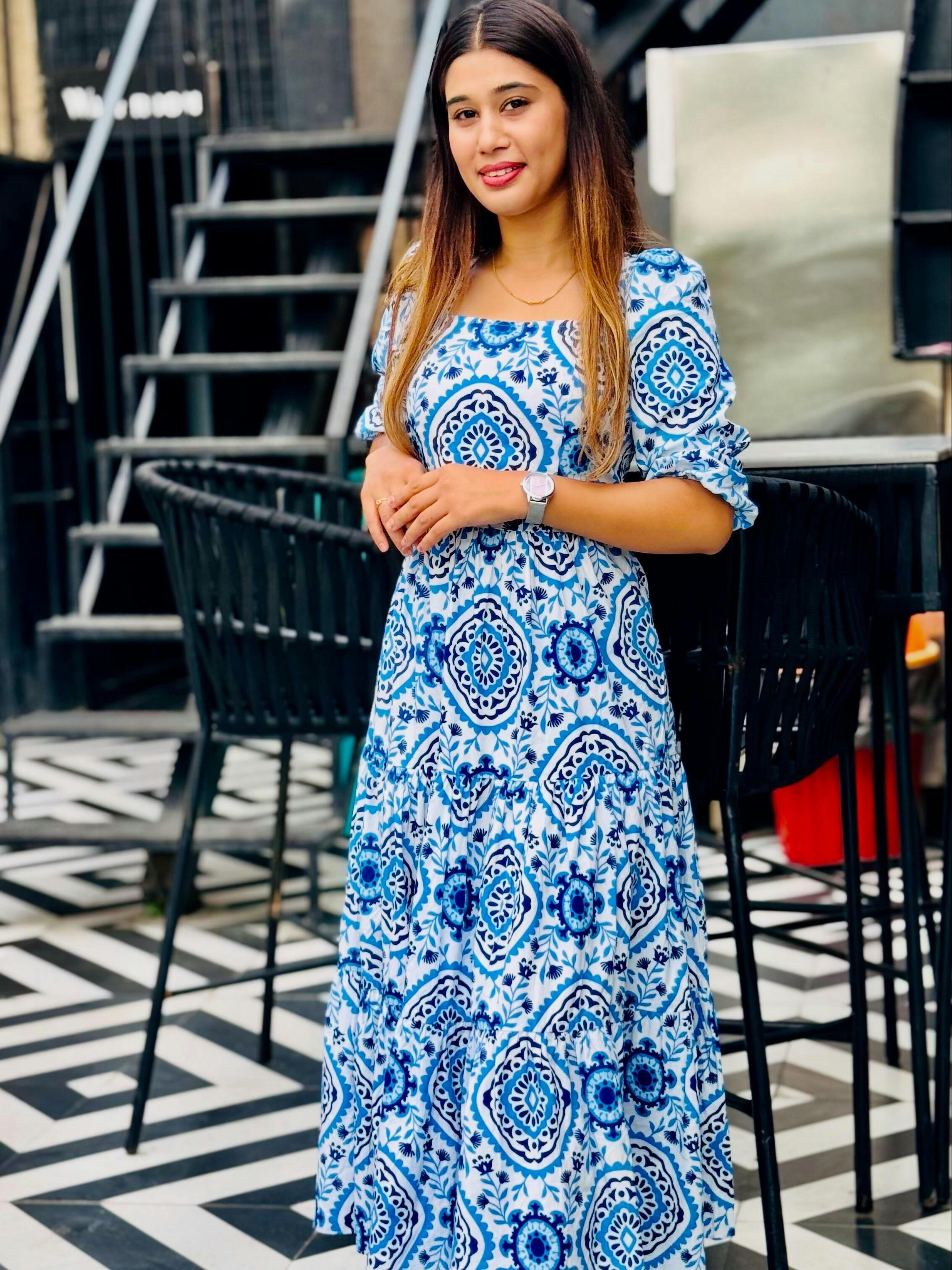 The Blue Exotic Midi Dress with abstract print is a timeless blend of elegance and charm, perfect for making a lasting impression at any event. Its bold, vibrant blue hue exudes confidence and sophistication, ensuring you stand out effortlessly. Crafted from high-quality, breathable fabric, it promises all-day comfort without compromising on style. The midi length offers a flattering silhouette suitable for both formal gatherings and casual outings. Whether paired with heels for a glamorous look or sandals for a relaxed vibe, this versatile dress is a true wardrobe essential. Ideal for parties, dinners, or special celebrations, the Blue Exotic Midi Dress reflects your unique style while keeping you effortlessly chic and confident.